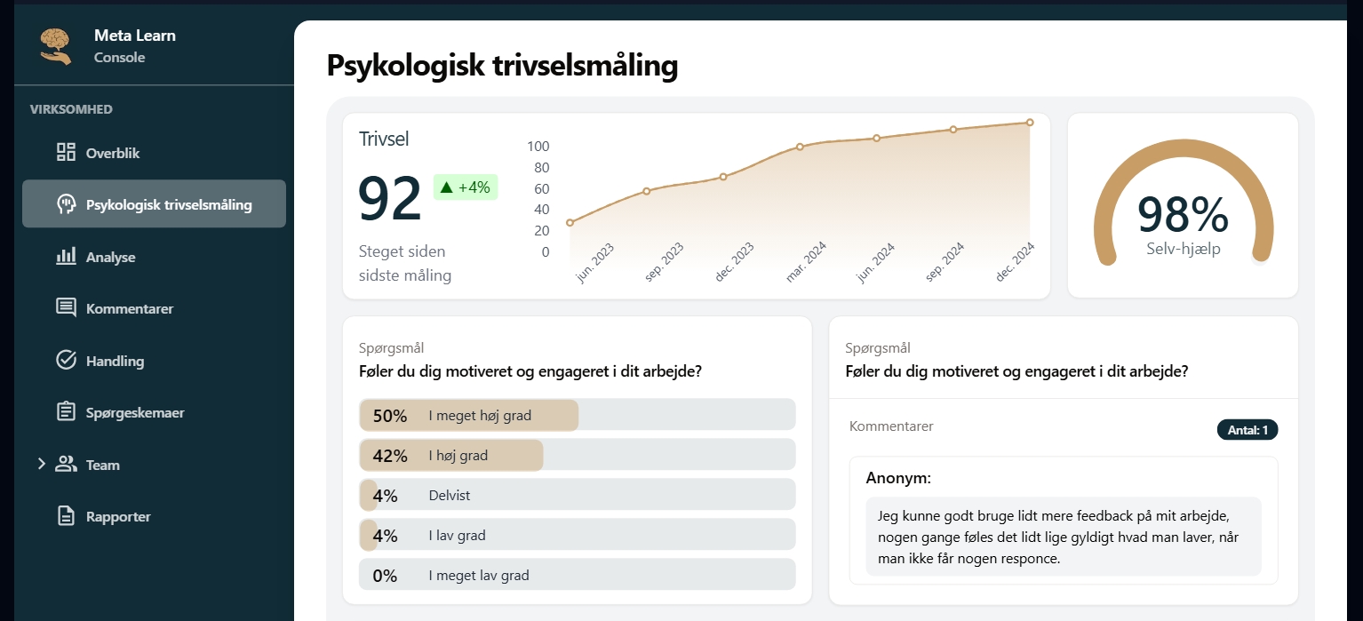 Overblik over trivsel, stressniveauer, trends og anbefalinger til forbedringer.
